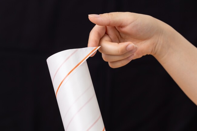 今回コメリオリジナルブランド「アテーナライフ」から発売された「斜めカット粘着クリーナー スペアテープ カーペット用」は、らせん状にテープがカットされているので、端をつまんで引っ張るだけでスルンとめくることができます。さらに、テープの端に赤いラインが入っていてめくり口がパッと見つけやすいので、テープをカットする手間もなく、気持ちよくお使いいただけます。