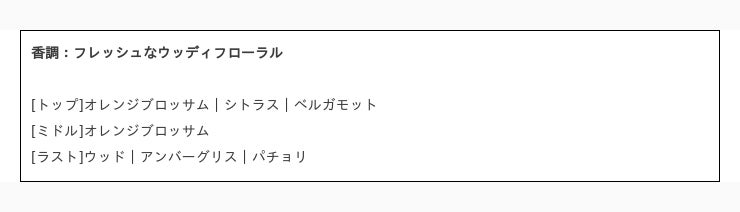 やわらかくセンシュアルなオレンジブロッサムとフレッシュでドライなウッディノートで、2つのコントラストが織りなすモダンマスキュリン。
