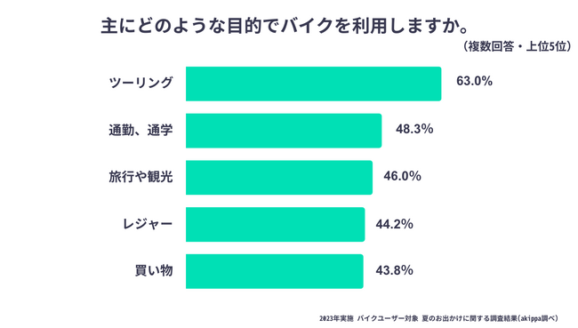 バイクを利用する目的を聞いたところ「ツーリング」(63.0%)、「旅行や観光」(46.0%)、「レジャー」(44.2%)などおでかけ目的で利用する方が多いことがわかりました。