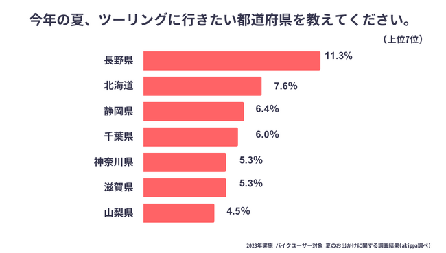 今年の夏、ツーリングに行きたい場所を聞いたところ、順位の変動はあったものの上位5位は昨年と変わらない結果となりました。「長野県」(11.3%)「北海道」(7.6%)など自然豊かで避暑地の印象があるエリアの人気が伺えました。また第6位に「滋賀県」(5.3%)が西日本エリアで唯一ランクインしています。