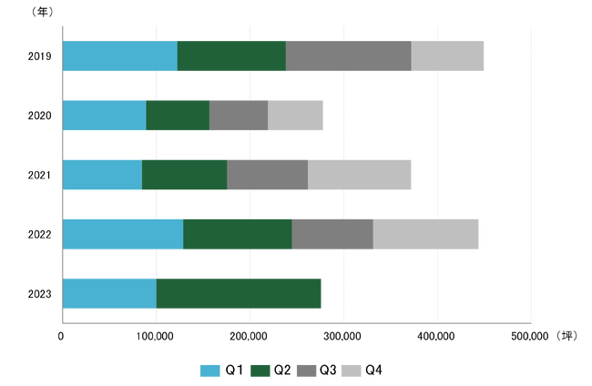 2023年第2四半期は、今年や来年以降竣工予定の建築中ビルでの大口の成約が含まれており、成約面積の伸びに繋がっている。今年は20万坪超の大量供給が予定され、まとまった面積の空室を抱えた新築ビルの竣工により空室率の上昇が続く。一方、供給によりオフィス需要も刺激されることから、今後もリーシング活動の拡大傾向は続く可能性が高い。(チーフアナリスト 今関豊和)
