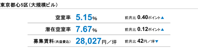 空室率は前月比プラス0.40ポイントの5.15%となり、2014年3月以来の5%台に上昇した。前月に続いて新築ビルが空室を抱えて竣工したことに加え、統合移転により生じた大口の募集床が現空となっている。潜在空室率も前月比プラス0.12ポイントの7.67%となり、空室率同様に2ヵ月連続で上昇した。
