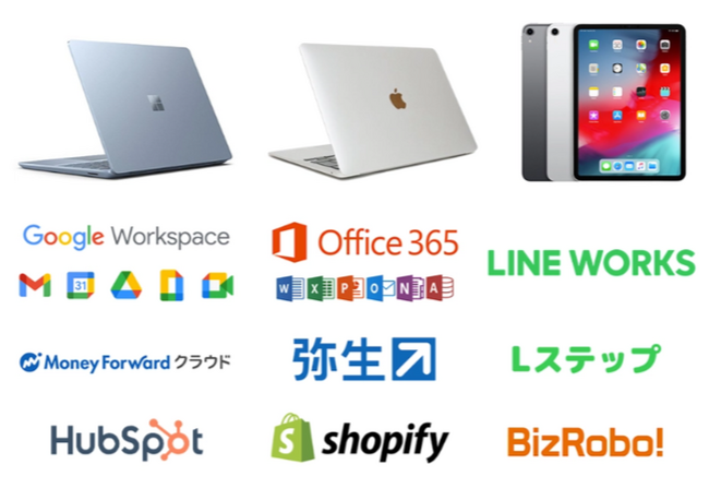 PCやタブレットだけでなく、顧客管理、勤怠、シフト管理、ISO、ECサイト、人事評価、能力診断、MA(マーケティングオートメーション)、マーケティング分析、SEO、音声解析、SMS送信、飲酒検査、RPA、原価計算、スケジュール管理、グループウェア、受付ロボシステム(・・・順次増加中)など様々なツールを取り扱っています。