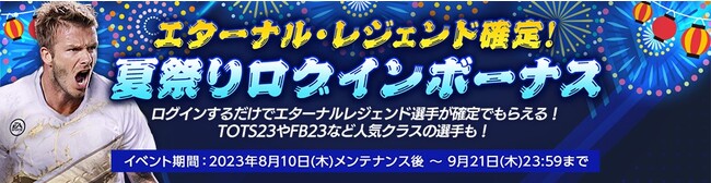夏休みを楽しんでもらうために、期間中ログインするだけで永続的に成長する「エターナル・レジェンド選手」や、「[TOTS23確定]115-122選手パック」、「[FB23確定]117-124選手パック」など豪華報酬を獲得できるログインボーナスを実施いたします。毎日ログインし、忘れずにお受け取りください。
