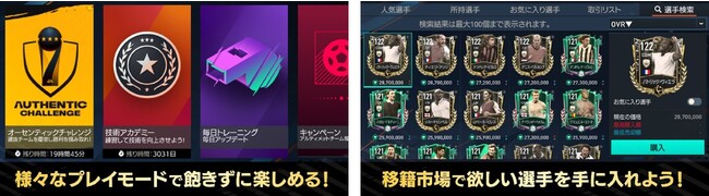 『FIFA MOBILE』では、本物のクラブや選手を使って自分だけのオリジナルチームを作り、11対11のオンライン対戦はもちろん、ゴール数を競う「VSアタック」、昇格・降格ありの本格的なリーグ戦を体験できる「シミュレーションリーグ」、戦術や指示を駆使してリーグ昇格を目指す「マネージャーモード」、各種スキルゲームなど、お好みに合わせて多彩なコンテンツをお楽しみいただけます。また、背番号を含む多彩なカスタマイズが可能な「ロッカールーム」機能で、自分だけのチームを作ることもできます。