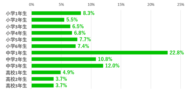 今回の調査では、夏期講習に通わせる予定はあるかという質問に 26.8%の方が「はい」と回答し、約3割が夏期講習を受講しているという結果になりました。また学年別の傾向としては小中高と共通して学年が上がるごとに増加傾向となり、夏期講習を受講している割合が最も大きかったのは中学3年生で 53.8%と、約2人に1人が夏期講習に通っていることが明らかになりました。