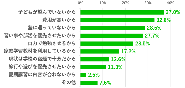 夏期講習を受講させない理由として、「子どもが望んでいないから」「費用が高いから」「塾に通っていないから」が僅差で上位3つに挙げられました。子どもの意思や費用といった問題の他、塾に通わせていないご家庭にとっては、夏期講習はハードルの高いもののようです。