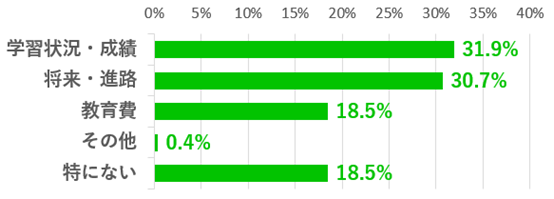 また、学習面において心配なことで最も票が多かったことが「学習状況・成績」次いで「将来・進路」でした。夏期講習を受講しないご家庭でも、多くの方がお子さまの学習状況や進路を気にしていることが伺えました。