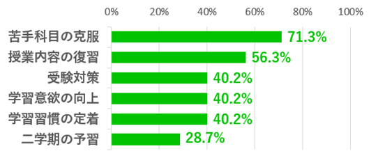 夏期講習の授業内容に求めることとして最も高い結果となったのが「苦手科目の克服」、次いで「授業内容の復習」となりました。一学期の授業で学んだことを夏休みの間に復習し、苦手を無くすことを目的に受講させている方が多いようです。また夏期講習を受講する上で不安に思うこととしては、「子どものモチベーション維持」「費用が高い」が多くの票を集めました。