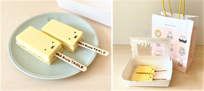 横浜店、神戸店オープン以来、人気のミッフィーチーズケーキバー。写真右のピンクのオリジナルペーパーバッグ(別売)にぴったりおさまるサイズのボックスでテイクアウトできます。ミッフィー好きの人への手土産に購入する人も多い商品です。