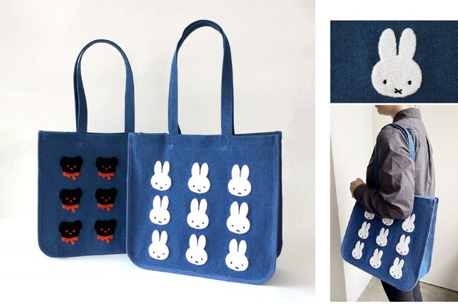 ミッフィー、ブラック・ベアがそれぞれ刺しゅうされた、サガラ刺しゅうバッグのビッグサイズが登場。内側にはボトルホルダーがついているので、ディック・ブルーナ テーブルで瓶入りのジュースやワインを買って持って帰るのに便利な大きさです。底まちも幅広なので、テイクアウト用のチーズケーキバーも入れられます。持ち手が長く、生地にはしっかりしたデニムを使用していて、普段のお買い物にもご使用いただけます。内側がコーティングされているのでお手入れが便利なのと、内側ポケットのほかに両側ポケット付きの機能性も兼ね備えています。