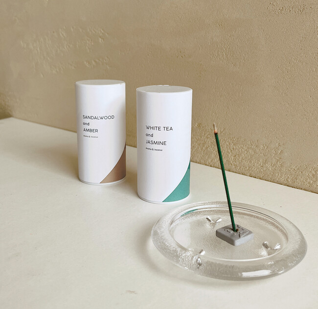 お香として馴染みの深い白檀(サンダルウッド)とほどよく甘いアンバーをブレンドした「サンダルウッド&アンバー」と、ほんのり香るホワイトティーとジャスミンがさわやかな「ホワイトティー&ジャスミン」の2種類。