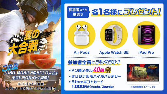 「この夏、最高の思い出を作ろう!」をコンセプトに、来たる8月19日(土)に東京ビッグサイトで大規模オフラインイベントを開催いたします。イベントでは、「ドラゴンボール超テーマモード」を使用したSOLOマッチも2回実施され、各マッチの入賞者にはドン勝メダルとAmazonギフトカードが贈られます(1位ドン勝メダル100個/50,000円分、2位ドン勝メダル80個/30,000円分、3位ドン勝メダル50個/10,000円分、モストキルドン勝メダル50個)。また、今回は入賞者だけでなく参加者全員を対象に豪華な特典と賞品が用意されています。まず参加者全員にドン勝メダル40個、オリジナルバッテリー、Storeギフトカード1,000円分が贈られ、さらには抽選でiPad Pro(1名)、Air Pods (1名)、Apple Watch SE (1名)が当たるチャンスも用意しております。