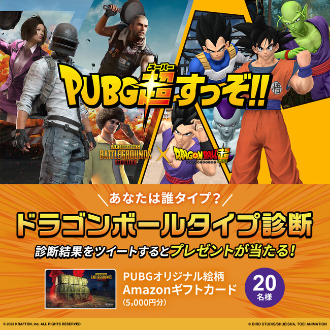今回のコラボレーションで登場するドラゴンボール超キャラクターのうち、あなたにオススメの操作タイプを診断することができる「ドラゴンボールタイプ診断」コンテンツを実施します。さらに、診断結果をSNSでシェアするとPUBGオリジナル絵柄Amazonギフトカード5,000円分が当たるチャンスがあります。開催期間は8月11日~8月31日です。