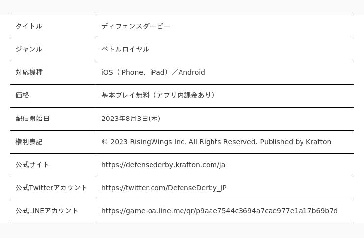 ・Google Play :https://play.google.com/store/apps/details?id=com.krafton.defensederby