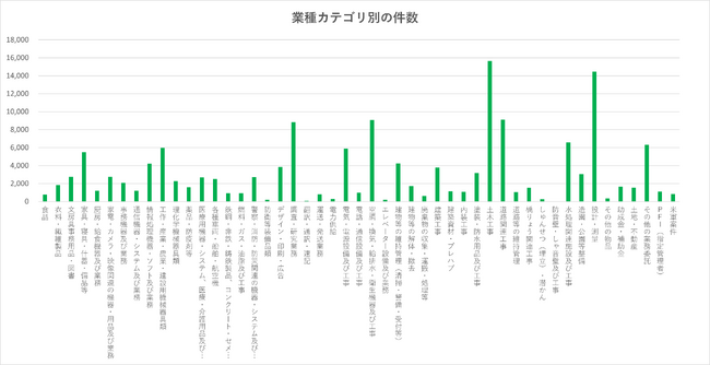 複数の業種カテゴリが1案件に付与されることがあるため、業種カテゴリの合計件数が月別の入札・公募件数にはなりません。