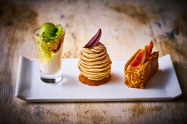9月~10月は、白ぶどうゼリーとレモン風味のクリームチーズを重ねた「ぶどうのヴェリーヌ」、栗の甘みがたっぷり味わえる「笠間の栗モンブラン」、パリパリ生地とバターが入ったカスタードクリームの相性が抜群な「いちじくのミルフィーユ」をご用意いたします。館内のケーキ&ベーカリーショップでも販売するスイーツをアレンジしたミニサイズ3種をお楽しみください。ドリンクはコーヒーまたは紅茶をお選びいただけます。(プチガトーは季節毎にメニューを変えてご用意いたします。)