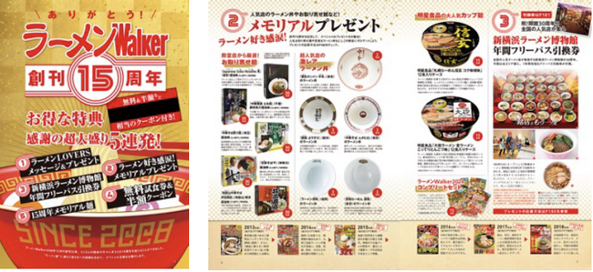創刊15周年特大号は、全エリアで昨年よりページ数を増量。巻頭企画では、無料や半額で絶品ラーメンを試食できるお得な特典をはじめ、歴代表紙出演者など「ラーメンWalker」ゆかりのラーメンLOVERSからのメッセージ、激レアラーメン丼や人気お取り寄せ麺などが当たるプレゼント企画など、うれしいコンテンツが盛りだくさんの内容です。