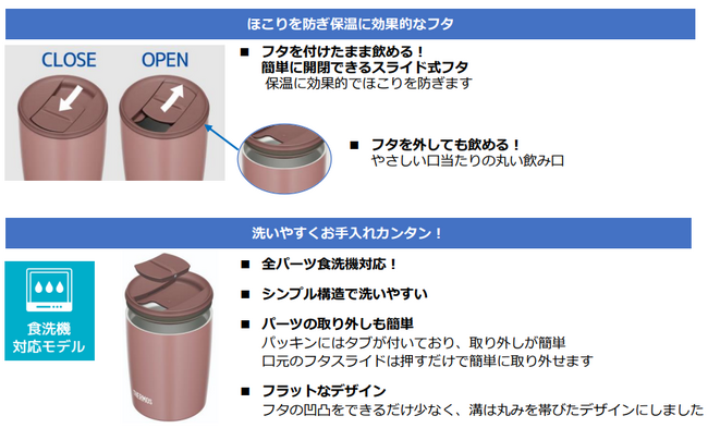 2021年に発売した『サーモス 真空断熱タンブラー(JDPシリーズ)』は、保温に効果的でほこりを防ぐスライド式フタ付きのタンブラーです。簡単に開閉できるスライド式のフタで、フタをつけたまま飲むことができ、デスクワークにもぴったり。サーモスの他のタンブラーやマグカップと比べ、ご自宅よりもオフィスシーンでのご利用が多いアイテムです。シンプル構造でフタのパッキンやフタスライドは簡単に着脱できるのでお手入れも簡単。さらに全てのパーツが食洗機対応です。