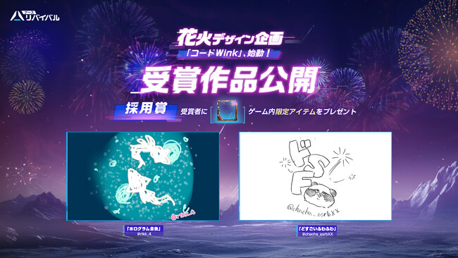内容:「スペースショー」の7日前から毎日、カウントダウン報酬を配布いたします。以前SNSで実施した花火デザイン企画「コードWink」で採用賞に選ばれた花火も配布。「スペースショー」当日に打ち上げていただく事が可能です。