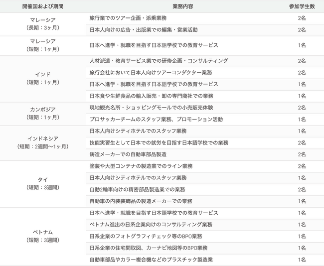 名古屋商科大学は、今夏もインドや東南アジア諸国6カ国にある日系企業や現地法人を対象とした、渡航型の海外インターンシップを実施し、30名の学生が参加します。22回目となる今回は、2週間から4週間の短期プログラムに加え、約3ヶ月間の長期プログラムも新設しました。この渡航型の海外インターンシップは、2012年の開始以来延べ903人もの学生が参加しています。海外でのインターンシップ期間以外にも、渡航前の事前研修、渡航後の事後研修、レポート課題や成果報告発表も行われ、国際的な視点や職業観の醸成を図る内容となっています。