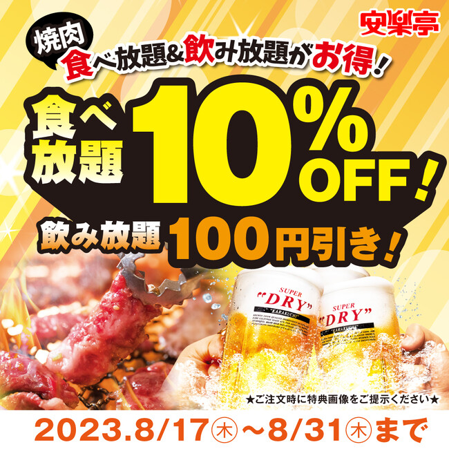 焼肉レストラン安楽亭(本社:埼玉県さいたま市、代表取締役社長:柳 先)は、夏休みも終盤、皆さんで元気に焼肉を満喫いただけるように、大変お得なキャンペーンを実施いたします。
