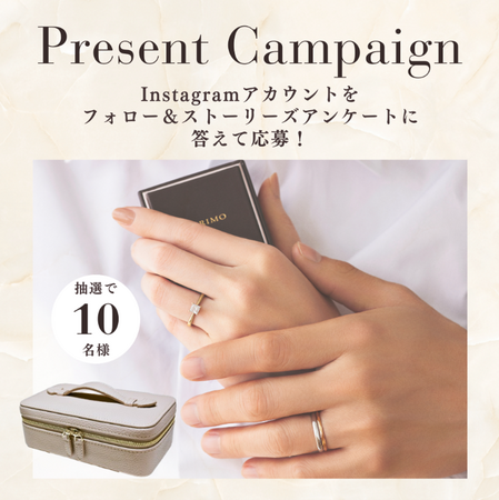 本キャンペーンは、アイプリモ公式Instagramのアカウントをフォロー、期間中に投稿されるストーリーズの質問に回答するだけで、ご参加いただいた方の中から抽選で10名様にアイプリモオリジナルバニティジュエリーケースをプレゼントいたします。キャンペーン期間中、一度でも回答いただいた方は対象となり、何度でもご参加いただけます。毎日17時頃にストーリーズが投稿されますのでどうぞお楽しみに。皆様のご参加をお待ちしております。