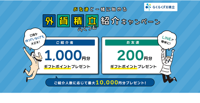 キャンペーン参加ページから参加登録をし、「giftee reward」をお友達登録している方(「ご紹介者様」)が、『らくらくFX積立』に興味をお持ちの方(「お友達」)を紹介していただき、後日その「お友達」が条件(新規口座開設)を達成された場合には、「ご紹介者様」にはもれなく1,000円分のギフトポイント、「お友達」にはもれなく200円分のギフトポイントをプレゼントいたします。