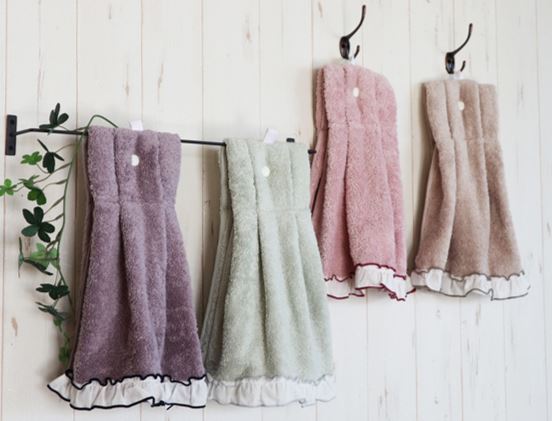 引掛け紐とスナップボタンがついているのでフック、タオル掛け、タオルリングなどに吊るせて便利。