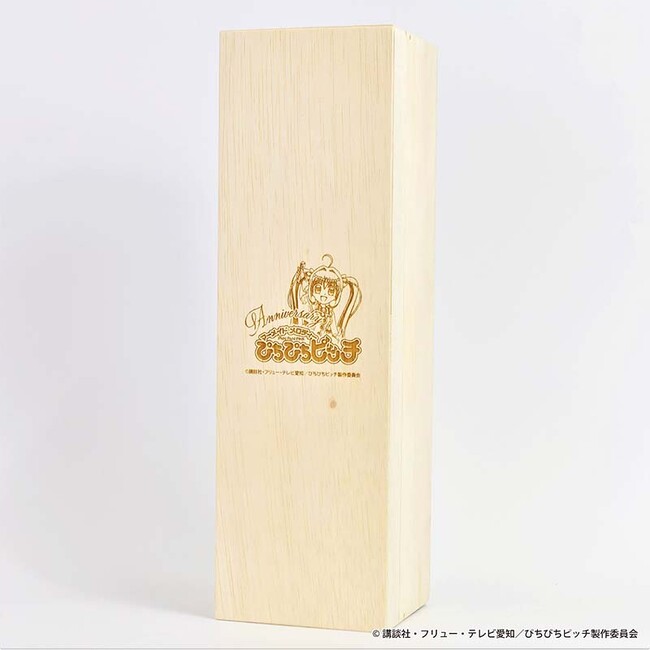 外箱にはコテで押したような作品のタイトルロゴに加えて、タイトルロゴの隣にはデフォルメされたキュートなるちあの姿も♪ さらに、彫刻ボトル同様に刻印された“Anniversary”の文字が、記念アイテムらしさをより際立たせています。