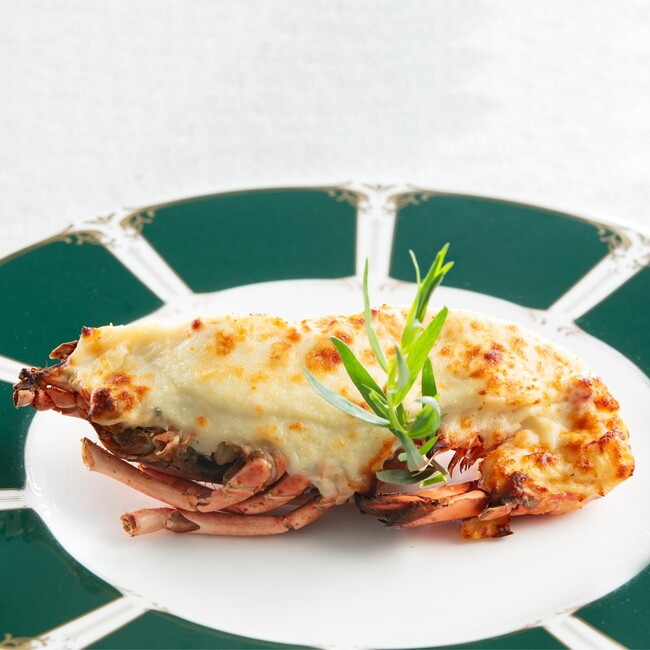 ホテルのレストランや婚礼料理として長年愛され続けてきた一品。オマール海老の身、たまねぎ、マッシュルームをソテーし、カルヴァドスブランデーでフランベしてから、粒マスタード入りの濃厚なベシャメルソースとともに、オマール海老の殻に詰めたテルミドールです。