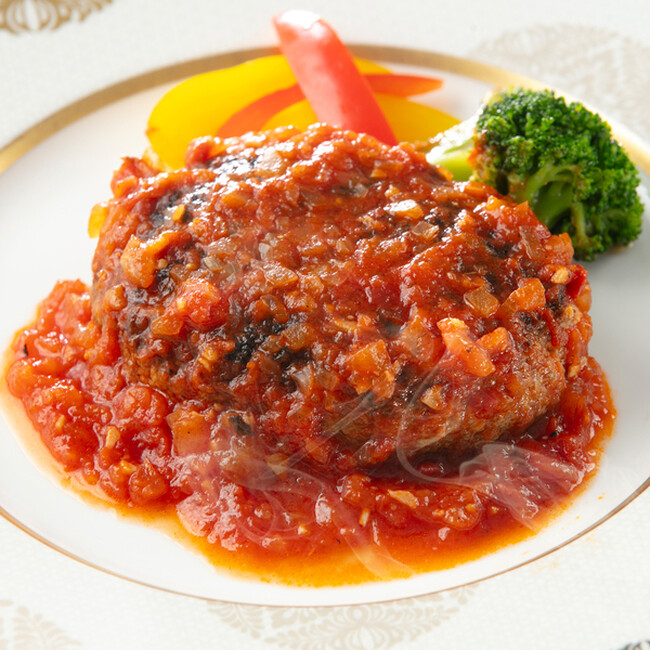 国産黒毛和牛と国産豚肉を使用した、ハンバーグステーキを、特製のトマトソースで煮込みました。