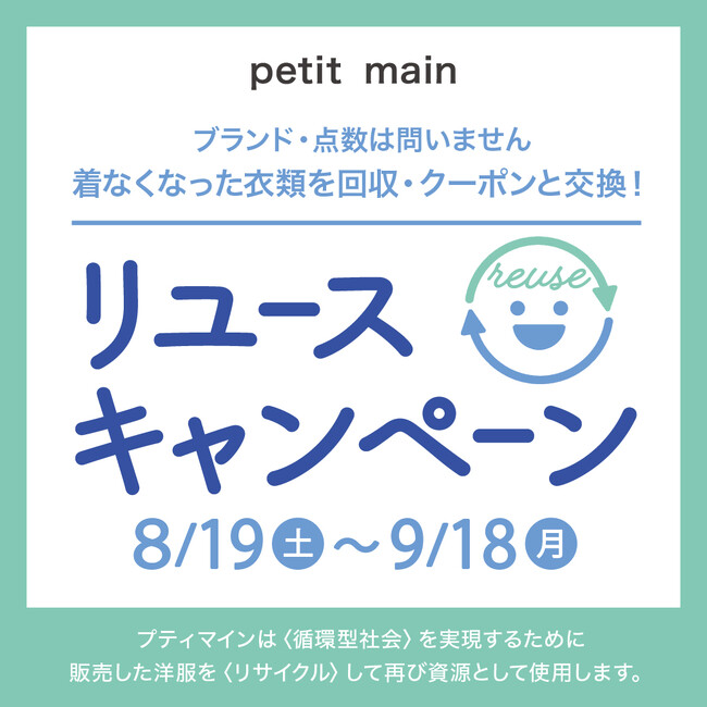 プティマインより、リユースキャンペーン好評開催中!9月18日(月・祝)まで、店舗にてブランド・サイズを問わず、着なくなった衣類を回収・クーポンと交換します。