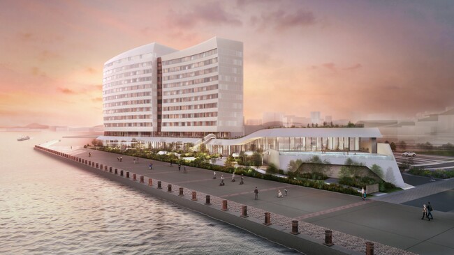 当施設は、ウォーターフロントの好立地を活かし、全室をオーシャンビューとし、客室内から関門海峡や行き交う船舶を間近に望むことができます。また、エリアになじむような設計になっており、敷地内にはガーデンエリアを配し自然と海との一体感を出すほか、施設内には地下からくみ上げた海水を活用したインフィニティプールを備えます。関門大橋の絶景を眺めながら、施設のプールで海水に触れるという、ここでしかできない特別な体験を創出するとともに、下関・関門海峡がもつ魅力を広く発信し、エリア全体の観光地としての魅力、そして知名度向上に貢献することを目指します。