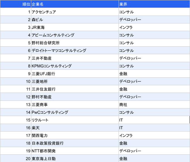 上位3社では、1位アクセンチュア、2位森ビル、3位JR東海という結果になりました。