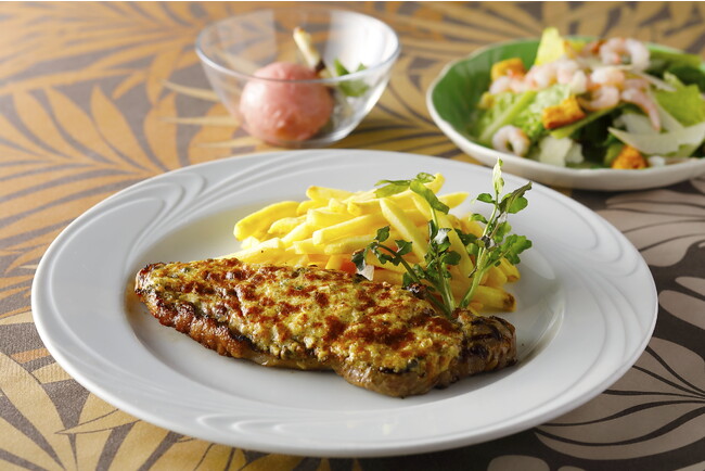 香ばしく焼き上げたU.S.産サーロインステーキに、グリーンペッパーやハーブをホイップバターで包み込んだトレーダーヴィックス伝統の「マラガシーバター」で仕上げた一皿。お肉の旨みと香り豊かなバターが食欲そそること間違いなしです。