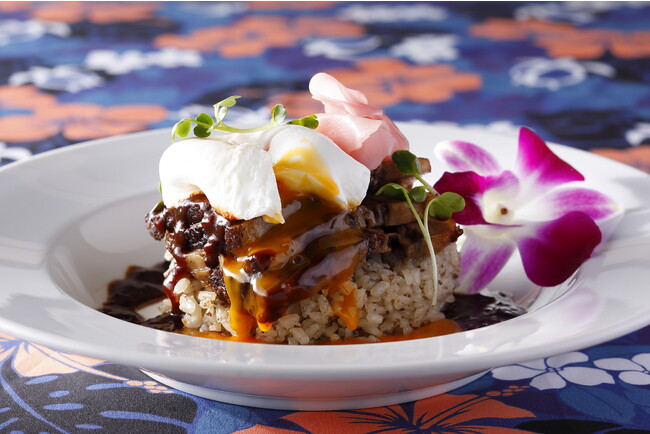 柔らかく煮込んだ肉厚の牛バラ肉とマッシュルームライスに、ブラックペッパー香るグレイビーソースと半熟卵のまろやかさが相性抜群の「ヴィックスロコモコ」。ピリッとスパイシーなソースと濃厚まろやかな半熟卵を混ぜて召し上がっていただくのがおすすめです。添えられたカブのピクルスがアクセントに。