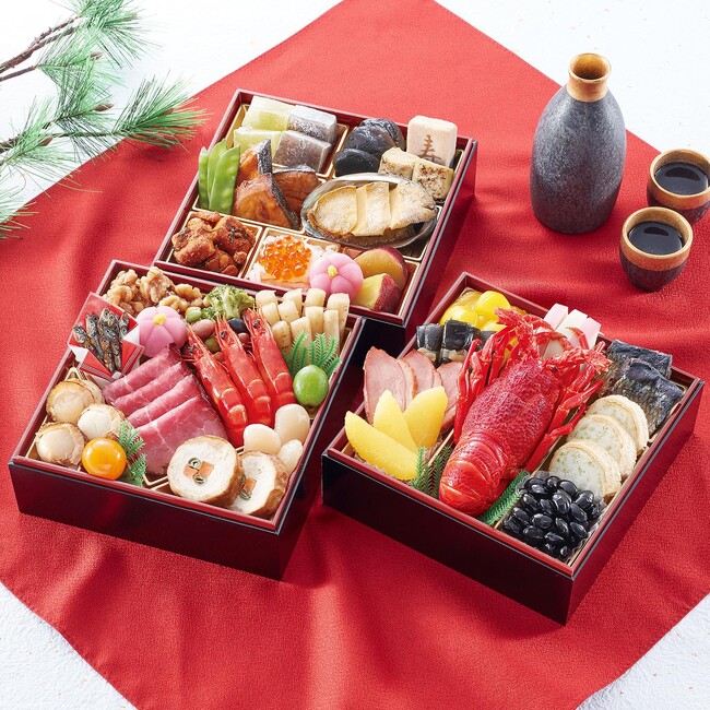 京都「ぎをん や満文」が監修したおせち三段重。一の重は、ロブスターをはじめとしたお子様も喜ぶラインナップとなっており、二の重・三の重では、定番の品を取り揃え、計三段で和洋中をバラエティ豊かに盛込みました。ポイント付与キャンペーン期間中は20%オフの15,800円(税込み)で販売され、コスパの良さもポイントです。