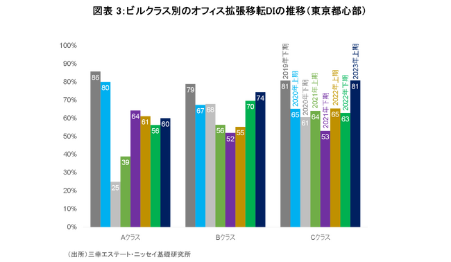 コロナ禍前後のビルクラス別※5のオフィス拡張移転DIの動向を見ると、コロナ禍前である2019年下期のオフィス拡張移転DIは、Aクラスビルが86%、Bクラスビルが79%、Cクラスビルが81%と、特にAクラスビルにおいて拡張意欲が強かった(図表 3)。IT企業を中心に企業の拡張意欲が強く、働き方改革や人材確保の観点からもオフィス環境を改善する動きが多く見られたため、この時期はAクラスビルの大量供給があったものの順調に吸収された。