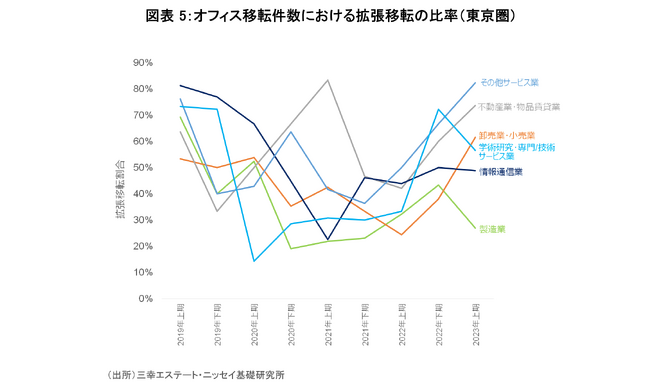 オフィス移転件数における拡張比率は、業種間で温度差が大きくなっている。拡張比率が高い順にその推移(2022年下期→2023年上期)を見ると、「その他サービス業(67%→82%)」>「不動産業・物品賃貸業(60%→74%)」>「卸売業・小売業(38%→62%)」>「学術研究・専門/技術サービス業(72%→57%)」>「情報通信業(50%→49%)」>「製造業(43%→27%)」となった(図表 5)。