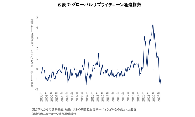 「製造業」では、2023年6月の日本の輸出数量は前年比▲4.8%と8ヶ月連続の減少を記録するなど、外需が低迷している※7。この要因としては、コロナ禍による供給制約の長期化や、欧米中銀の急激な利上げによる景気減速が影響していると考えられる。しかし、米ニューヨーク連邦準備銀行が公表するグローバルサプライチェーン逼迫指数を見ると、供給制約はすでに解消したことが示唆される(図表 7)。また、主要20カ国のOECD景気先行指数が2023年2月以降プラスに転じ、日本の輸出が増加する可能性が高まっている(図表 8) ※8。このように世界景気の回復により、「製造業」を取り巻く環境も好転することが期待される。