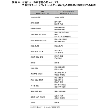 本稿では、東京都心部の16エリアについて分析を行った。同16エリアは、三幸エステート「オフィスレントデータ2023」における東京都心部の29エリアを、図表 11の通り、一部集約したものである。