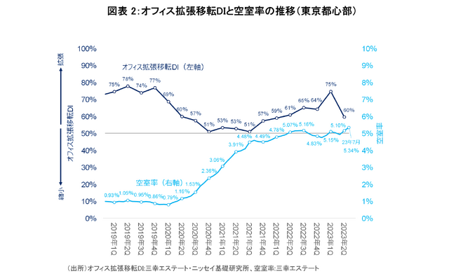2021年第4四半期以降、オフィス拡張移転DIは上昇し、2023年第1四半期には75%と、一時的にコロナ禍前の水準に達した。しかし、第2四半期には60%に低下し、オフィス需要の回復が一服した。既存ビルでは拡張移転や館内増床等の前向きなオフィス需要により空室床の消化が進んだものの、新築ビルが空室を抱えて竣工したため、空室率は2023年7月に5.34%(ボトム対比+4.55%)まで上昇した。