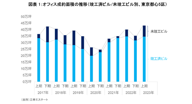 三幸エステートの公表データ※2によると、2023年上期の東京都心5区のオフィス成約面積は43.1万坪となり、2017年以降で最高を更新した(図表 1)。これは前年同期を+7.5%上回り、またコロナ禍前の2019年同期を+9.9%上回る水準である。