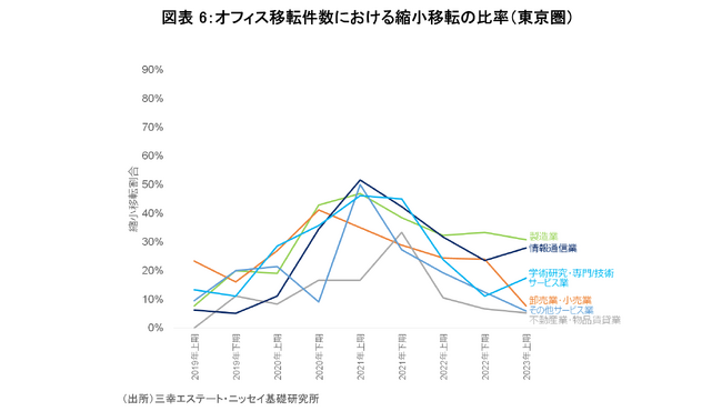 同様に、主要業種のオフィス移転件数における縮小比率も、二極化が進んでいる。縮小比率が低い順にその推移(2022年下期→2023年上期)を確認すると、「不動産業・物品賃貸業(7%→5%)」<「その他サービス業(13%→6%)」<「卸売業・小売業(24%→8%)」<「学術研究・専門/技術サービス業(11%→17%)」<「情報通信業(24%→28%)」<「製造業(33%→31%)」となった(図表 6)。