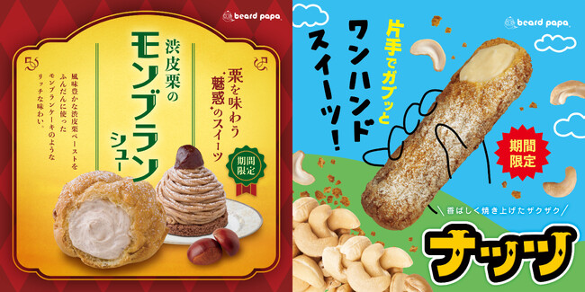 株式会社麦の穂(本社:大阪府大阪市北区、代表取締役:杉内健吉)は、シュークリーム専門店ビアードパパにて2023年9月1日(金)より2種類のシュークリームを期間限定で発売いたします。“渋皮栗のモンブランシュー”はビアードパパで毎年人気の高い秋の味覚であり、まるでモンブランケーキのようなリッチな味わいが最大の特徴です。また同時発売される“ナッツ”はスティック状に香ばしく焼き上げたザクザク食感の専用生地にビアードパパ自慢のカスタードクリームを詰めたワンハンドで食べ歩きにも最適な商品です。「いつも できたて 作りたて」ご注文を受けてからクリームを詰める実演販売でお届けする自慢のシュークリームをぜひお試しください。