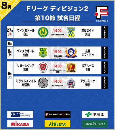 8月27日(日)にFリーグ2023-2024 ディビジョン2 第10節 ヴィンセドール白山 vs. ポルセイド浜田を開催いたします。今シーズンのFリーグディビジョン2は、「FリーグTV powered by easysports」で全試合を生中継いたしますので、ぜひご視聴ください!
