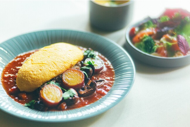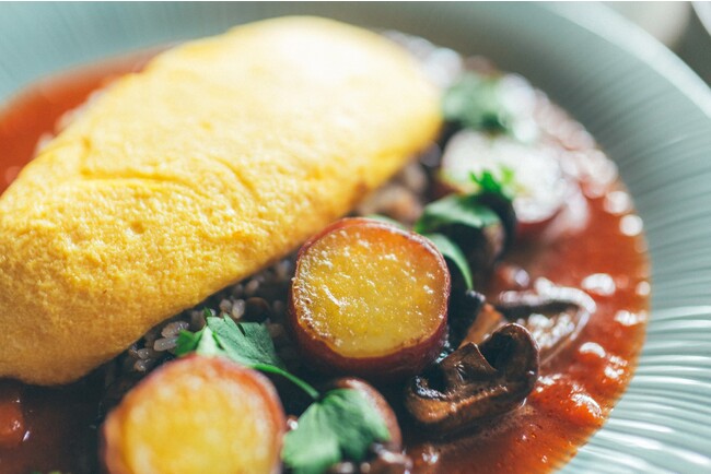和風だしの効いたトマトソースに秋の味覚『きのこ』と『さつま芋』を添えて『和』香るオムライスに仕上げました。
