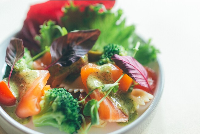 サイドメニューは、ショートパスタ『ファルファッレ』とタスマニアサーモンのサラダ バジル風味のソースです。