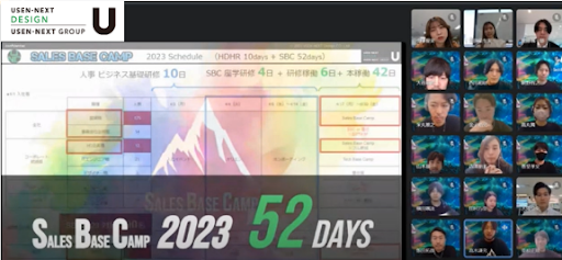 2018年に開始した「Sales Base Camp」は、USEN-NEXT GROUP に入社した新卒向けの新人研修です。「Magic Moment Playbook」の活用を 2021年より開始し、実践形式でデータにもとづいた経営と営業活動を体感できるプログラムを実施しています。約50日間にわたり、参加者は事業計画や販売戦略の立案を行い、営業活動においては「Magic Moment Playbook」を活動基盤とし、システム内に構築された USEN-NEXT GROUP の営業の型をもとに行動しながら、行動量や顧客へのアクテビティを可視化し、アクションにつなげるサイクルを学んでいます。本年度の研修では、USEN-NEXT GROUP が提供する「USEN のまるっと集客DX」内の商材が取り扱われました。